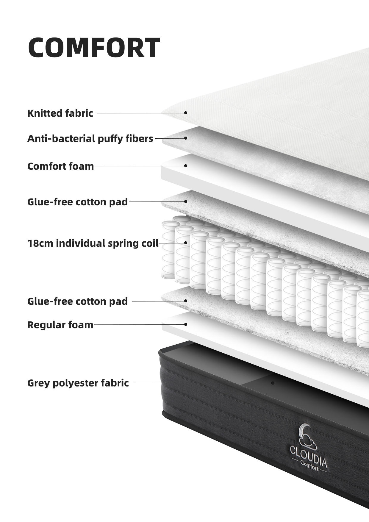 Šis aukštos kokybės čiužinys Cloudia Comfort sukurtas užtikrinti maksimalų komfortą, taisyklingą kūno padėtį ir ilgalaikį patvarumą. Daugiasluoksnė konstrukcija apjungia modernias medžiagas ir pažangius sprendimus, todėl čiužinys puikiai prisitaiko prie kūno, leidžia odai kvėpuoti ir užtikrina ramų, gilų miegą kiekvieną naktį.