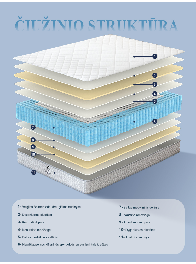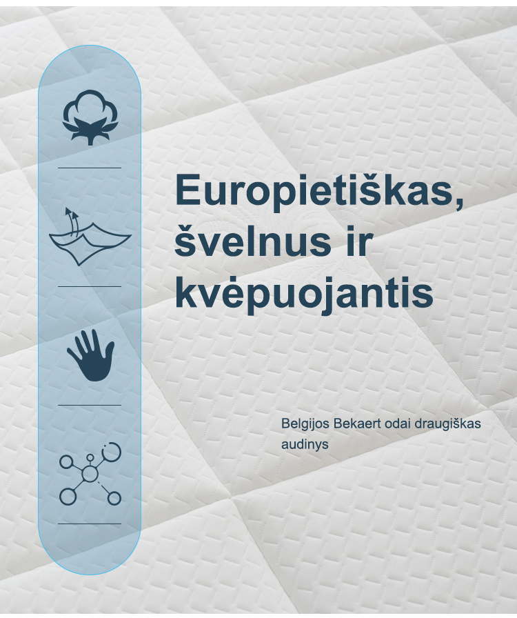 Viršutinis čiužinio sluoksnis – tai prestižinio Belgijos „Bekaert“ prekės ženklo audinys. Audinys sukurtas taip, kad būtų maksimaliai pralaidus orui, užtikrinant vėsumą ir sausumą visą naktį. Čiužinio medžiagos atitinka griežčiausius OEKO-TEX® Standard 100 ir CertiPUR-US® reikalavimus, todėl galite būti ramūs dėl savo ir šeimos sveikatos.