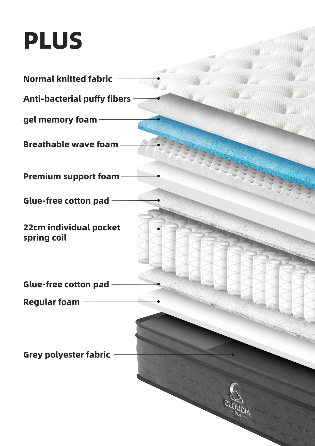 Čiužinio šonai apgaubti stilingu ir tvirtu pilku poliesterio audiniu, kuris ne tik atrodo moderniai, bet ir apsaugo čiužinį nuo nusidėvėjimo. Apatinis Regular foam sluoksnis užbaigia konstrukciją, suteikdamas jai tvirtą pagrindą.