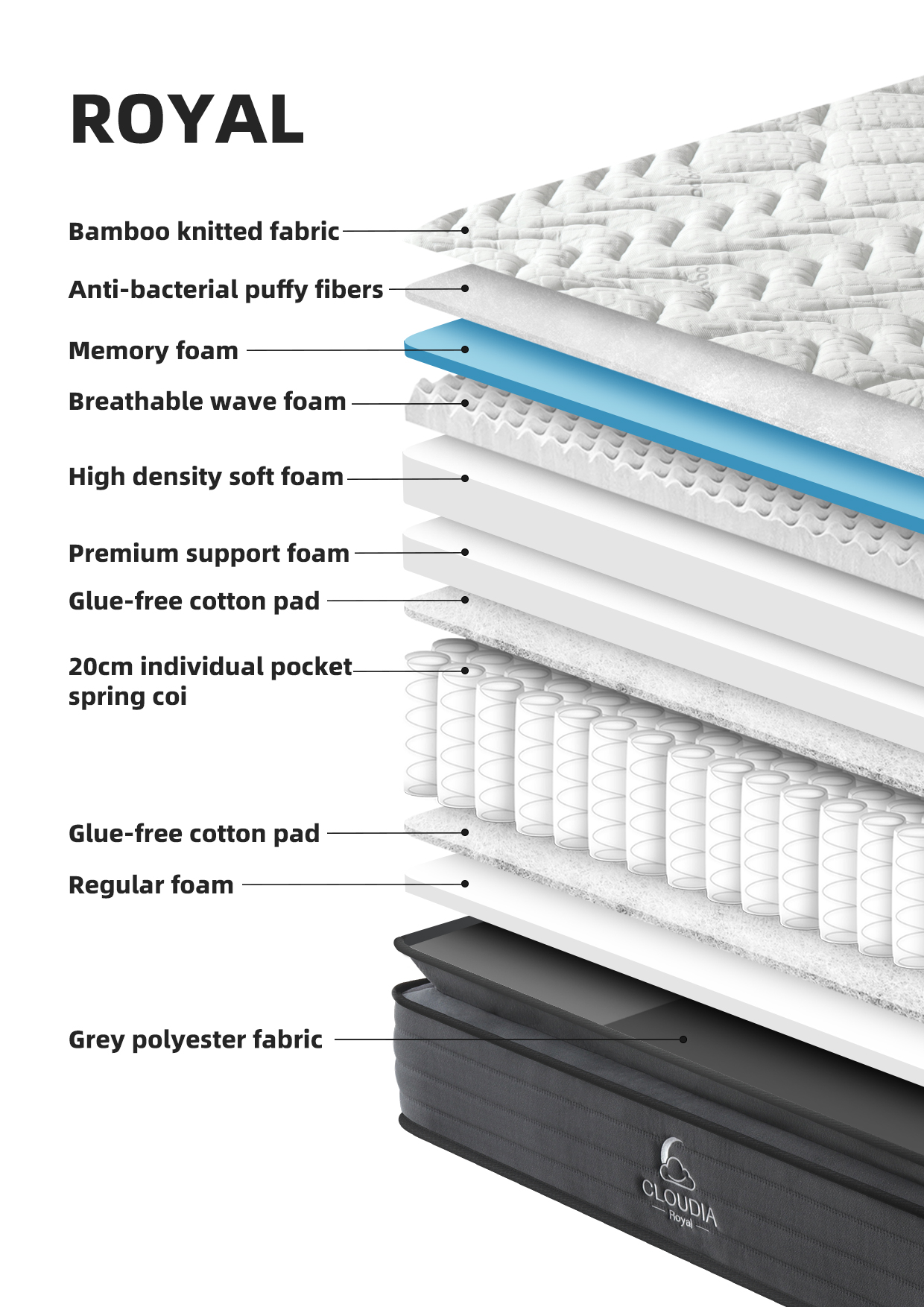 Skirtingai nei standartiniai modeliai, „Royal“ naudoja progresyvią putų kombinaciją: Memory Foam: klasikinės atminties putos, kurios reaguoja į kūno šilumą ir idealiai atkartoja Jūsų siluetą, Breathable Wave Foam: specialios bangos formos putos užtikrina nenutrūkstamą oro cirkuliaciją, High Density Soft Foam: papildomas didelio tankio minkštųjų putų sluoksnis, kuris suteikia tą „karališką“ minkštumo pojūtį, kurio trūksta įprastiems čiužiniams, Premium Support Foam: garantuoja, kad net ir po daugelio metų čiužinis neprarastų savo formos ir suteiktų stabilią bazę.